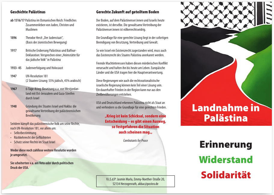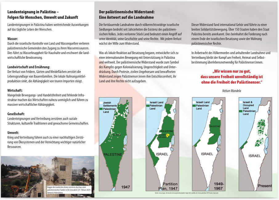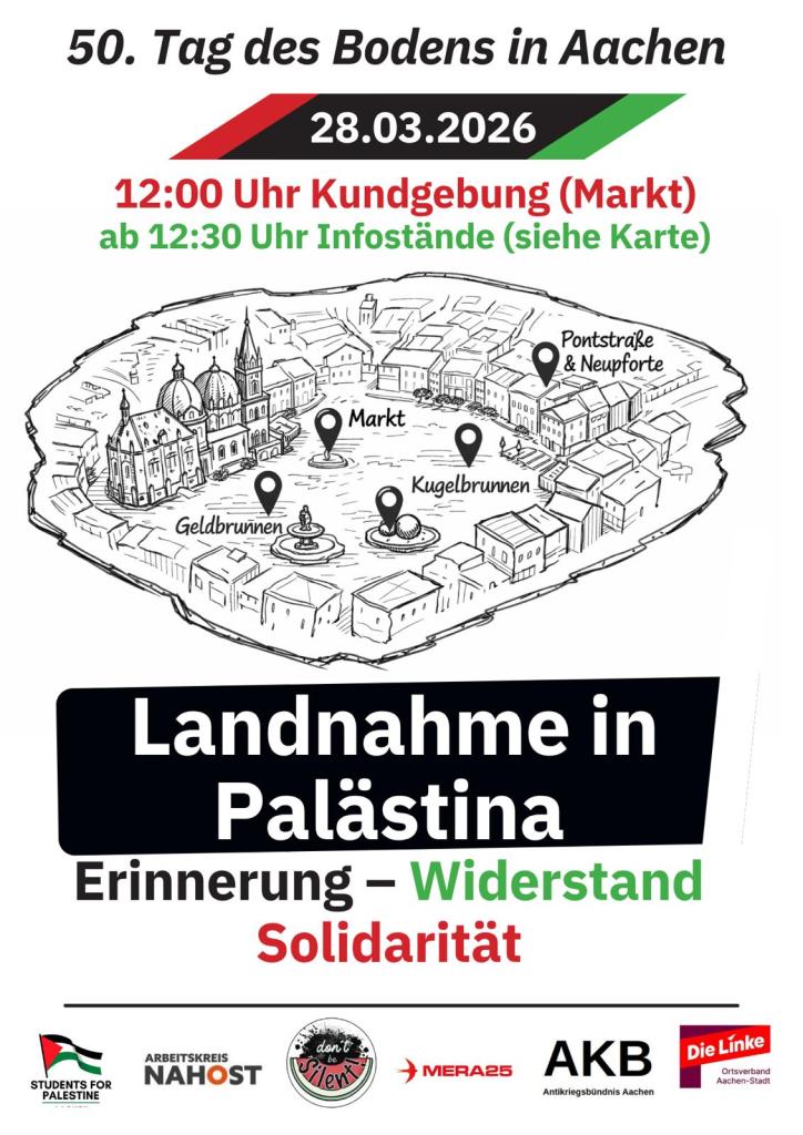 Wir weisen auf den „Tag des Bodens“ hin, der am 28.3.26 auch in Aachen begangen wird: Mit einer Kundgebung und mehreren Infoständen im Stadtzentrum wird die Bevölkerung über die Unterdrückung und Vertreibung der Palästinenser informiert.
