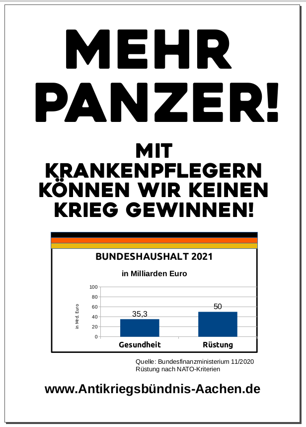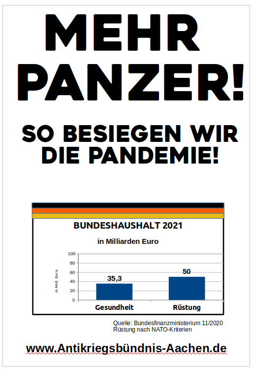 In der Woche vom 7.-12. Dezember soll der Bundeshaushalt für 2021 verabschiedet werden. Der Verteidigungshaushalt‘ soll um 2,6% auf rund 50 Milliarden Euro (nach NATO-Kriterien) steigen. Er ist damit um 15 Mrd. € höher als der Gesundheitshaushalt, trotz der Corona-Pandemie.