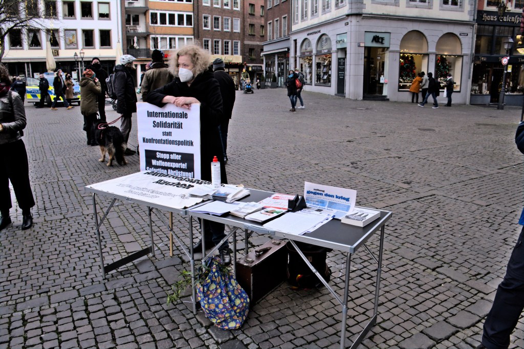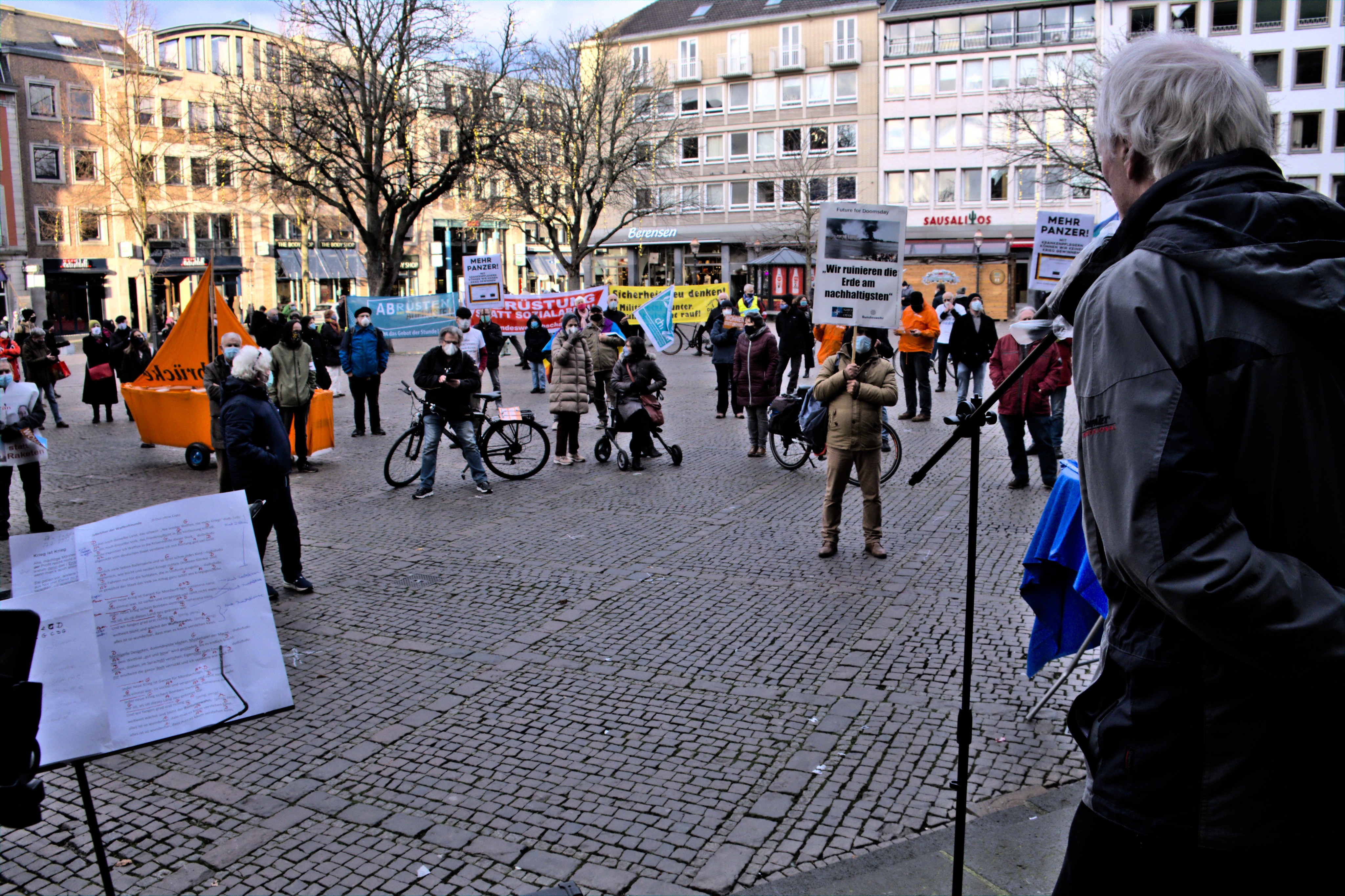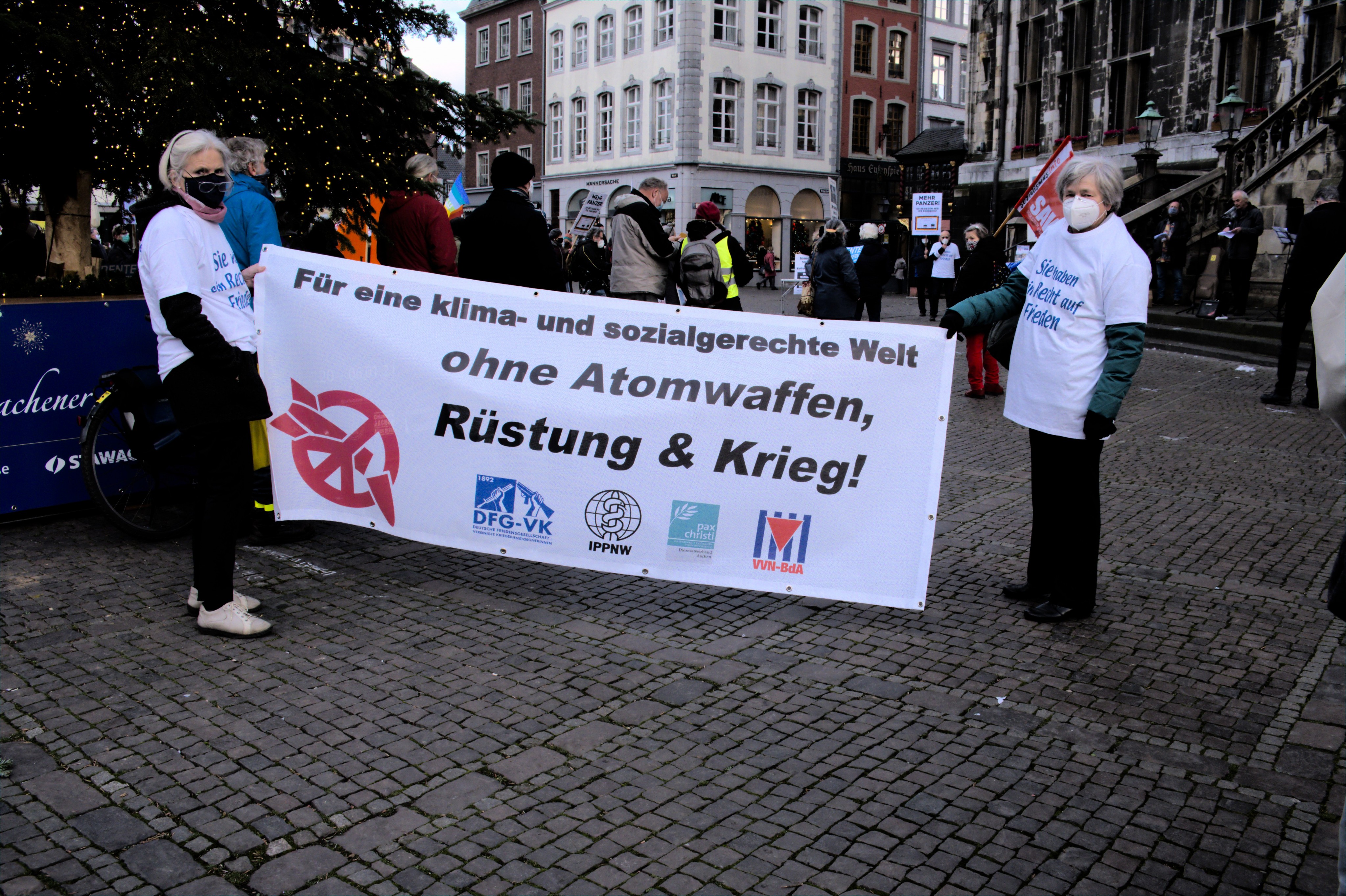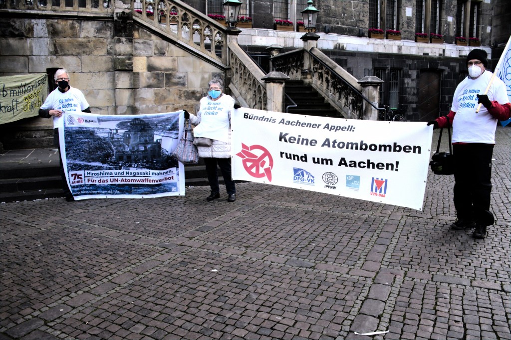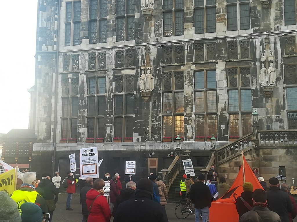 Reden: von links: VVN, Pax Christi für das Bündnis keine Atombomben rund um Aachen, DKP, Bürger+innen Asyl Aachen, Antikriegsbündnis