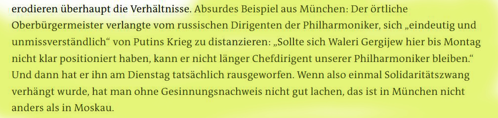 Geradezu grotesk wird es, wenn Theaterstücke abgesagt werden, wie in Augsburg, wo die Operette „Moskau, Tscherjomuschki“ von Dimitri Schostakowitsch am Staatstheater abgesagt wurde. Man könne es ukrainisch-stämmigen Schauspielern nicht zumuten, im Stück des Russen Schostakowitch, das in Moskau spielt, aufzutreten. FAZ 5.3.22 Das ist kein Einzelfall: