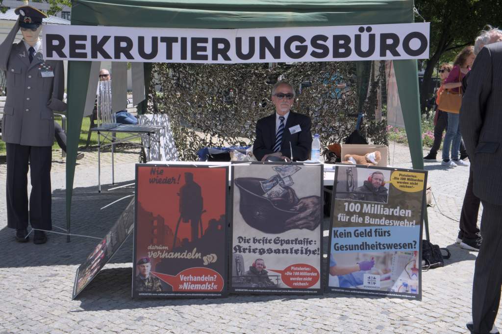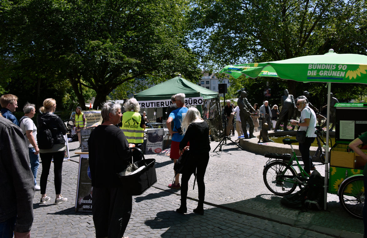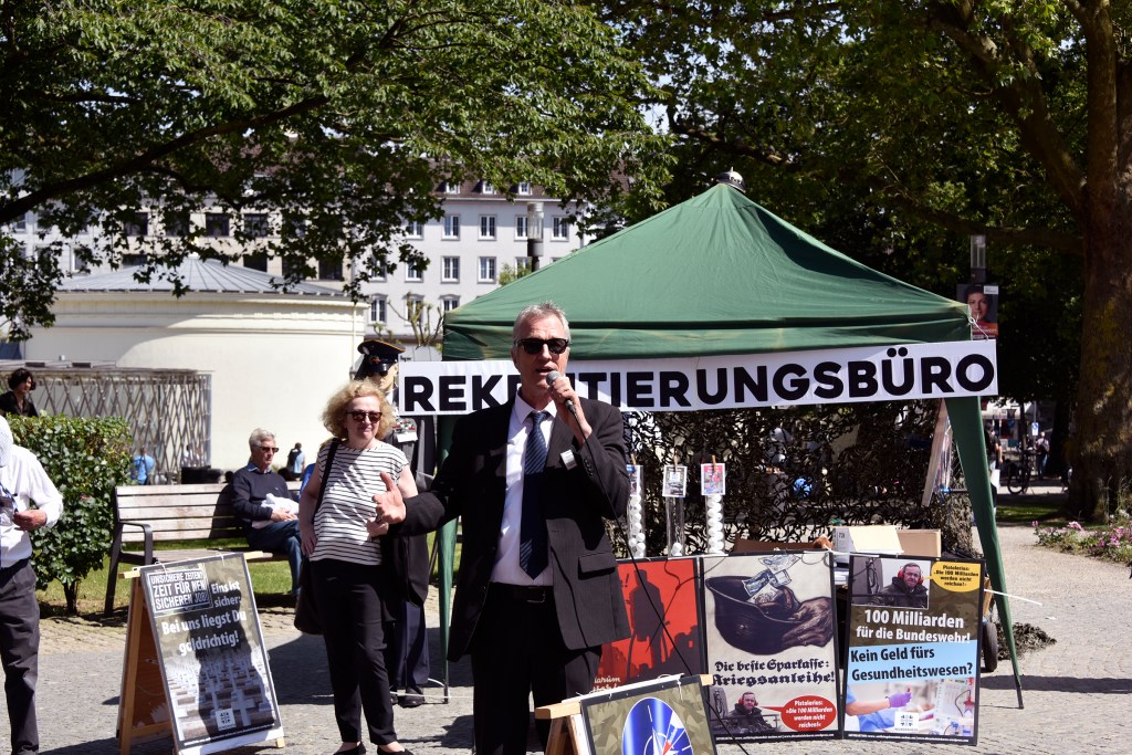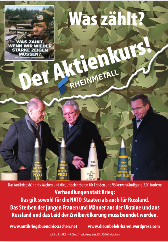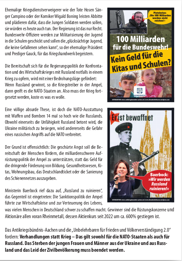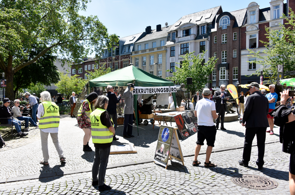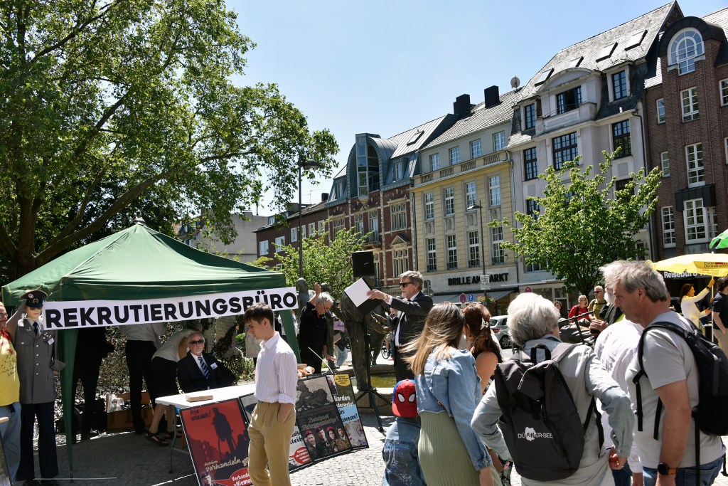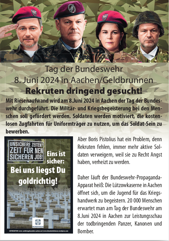 Am „Tag der Bundeswehr“ in Aachen informierten wir die AachenerInnen mit Flugblättern und einer satirischen antimilitaristischen Aktion über die Hochrüstung und Kriegsvorbereitungen (Kriegstüchtigkeit) der Ampel-Regierung.