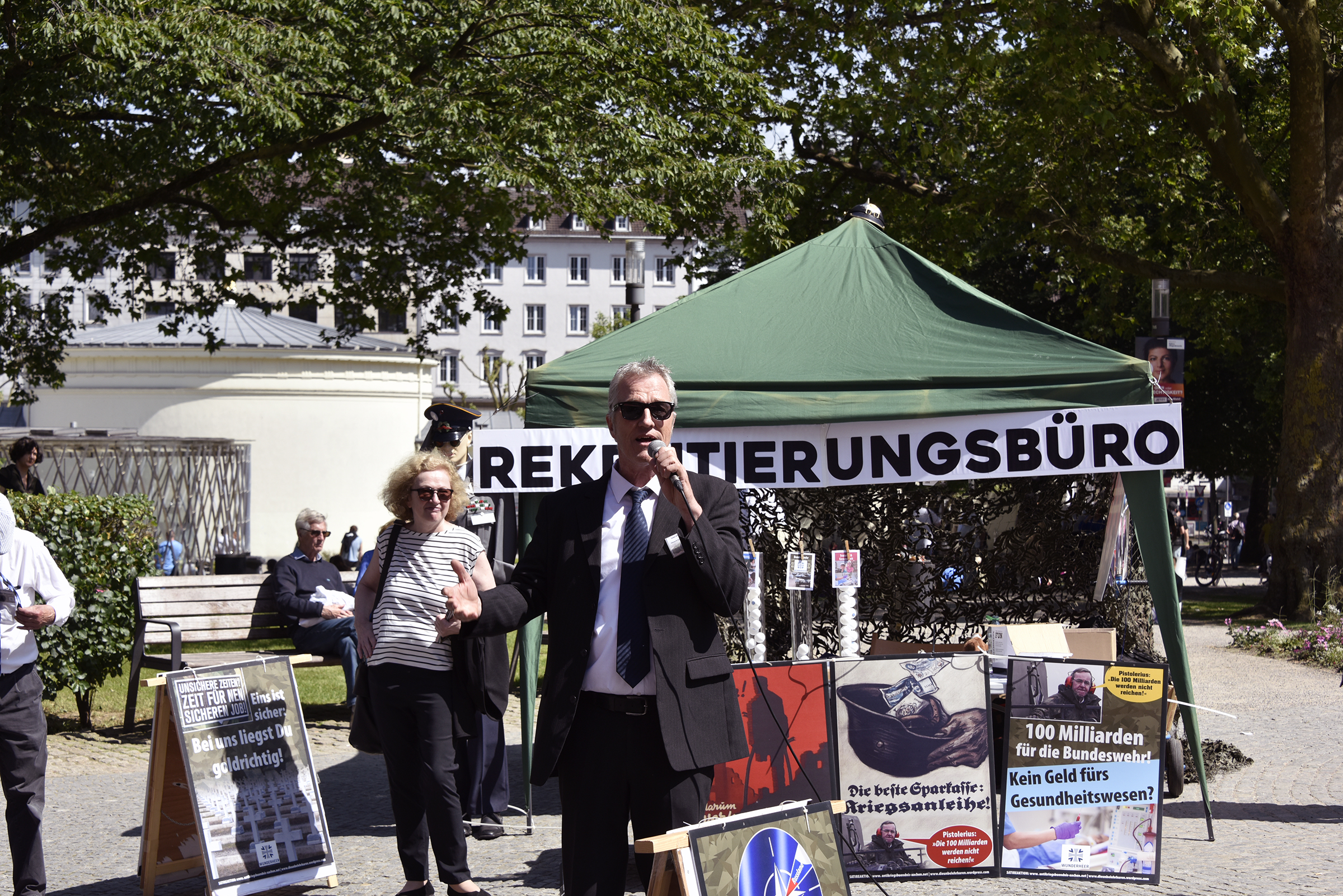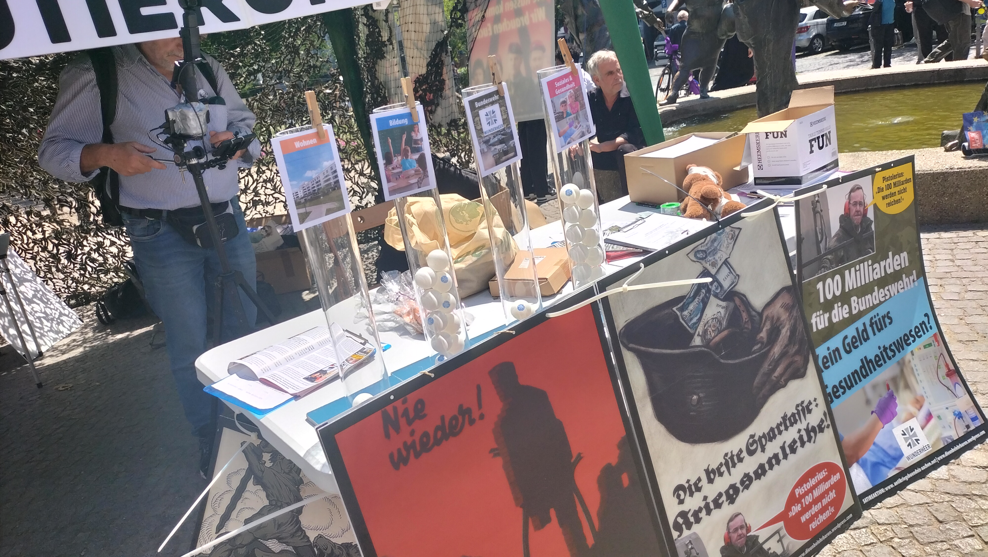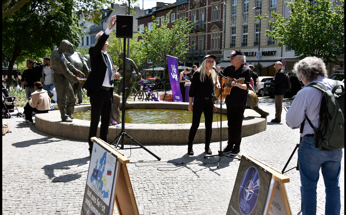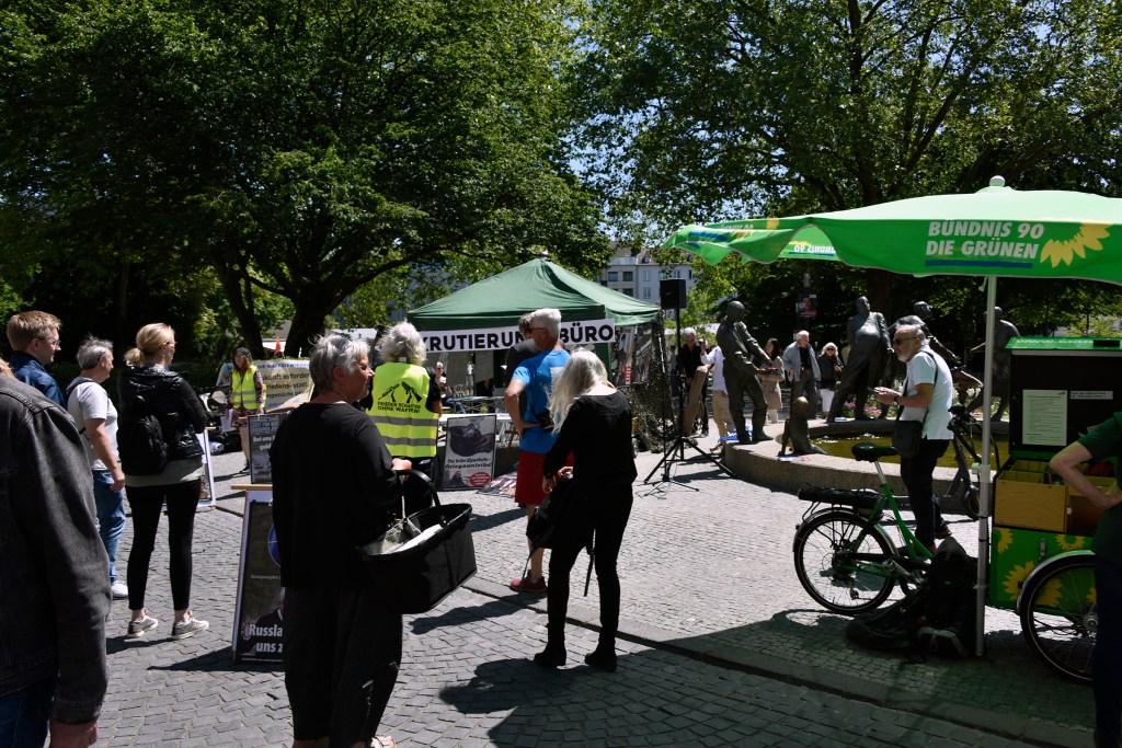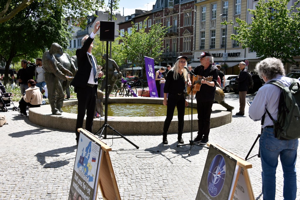 Am „Tag der Bundeswehr“ in Aachen informierten wir die AachenerInnen mit Flugblättern und einer satirischen antimilitaristischen Aktion über die Hochrüstung und Kriegsvorbereitungen (Kriegstüchtigkeit) der Ampel-Regierung.