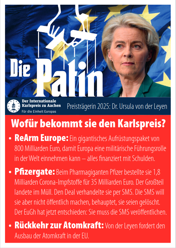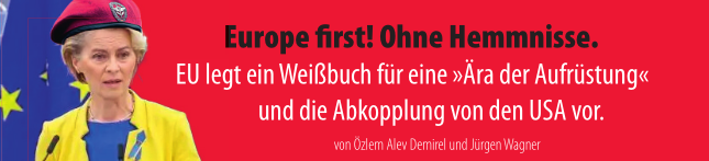 Als EU-Kommissionspräsidentin verkündete sie das größte Hochrüstungs-programm der EU, das es je gegeben hat. Als „Wiederbewaffnung Europas“ bezeichnet Frau von der Leyen den EU-Beschluss, 800 Mrd. € Schulden der EU-Staaten zu genehmigen und so wie die Merz/Klingbeil-Regierung gigantische Kriegskredite aufzunehmen.