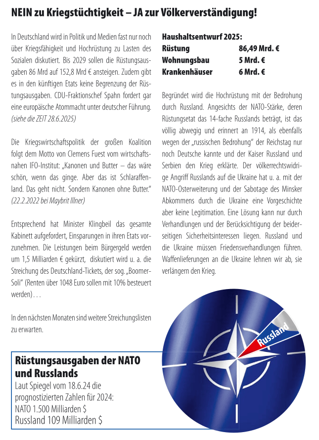 Nach der Auftaktkundgebung startet eine Demo zum Markt, wo eine Abschlusskundgebung stattfindet. Es sprechen Ralf Haupts (AKB) und VerteterInnen von SOL und sdaj zur Militarisierung der Gesellschaft, Hochrüstung und der geplanten Wehrpflicht.