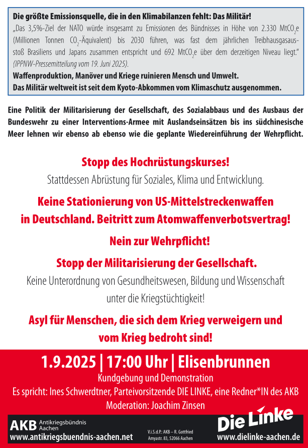 Antikriegstag 1.9.2025: Antikriegsbündnis Aachen und LINKE Aachen laden ein zu Kundgebung und Demonstration gegen Kriegstüchtigkeit und für Völkerverständigung