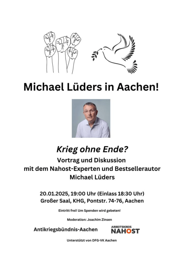 Im Zusammenhang mit der Vorstellung seines neuen Buches „Krieg ohne Ende? Warum wir für Frieden im Nahen Osten unsere Haltung zu Israel ändern müssen“, wird sich Dr. Lüders mit den brennenden Fragen und Problemen beschäftigen und anschließend zur Aussprache einladen.