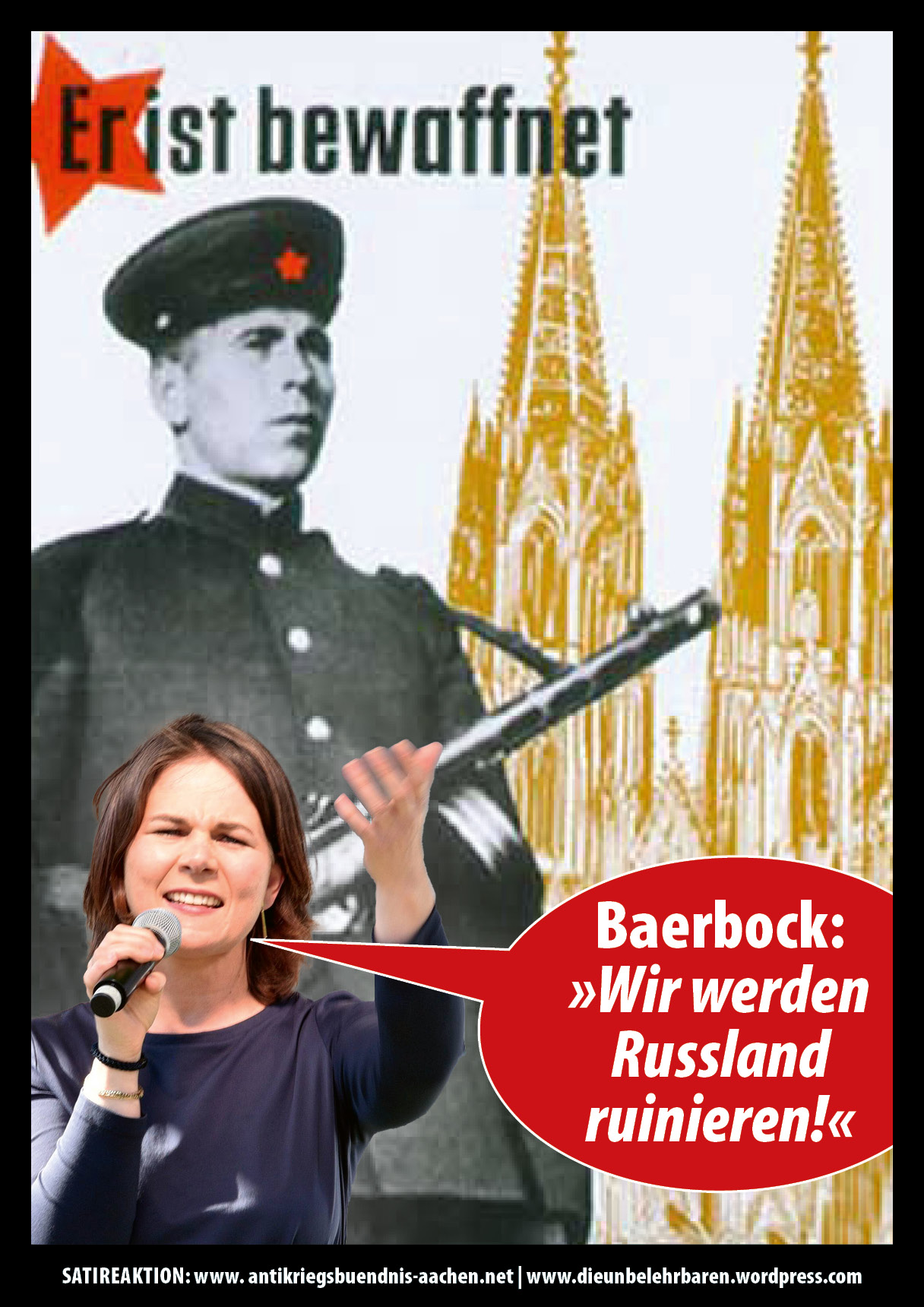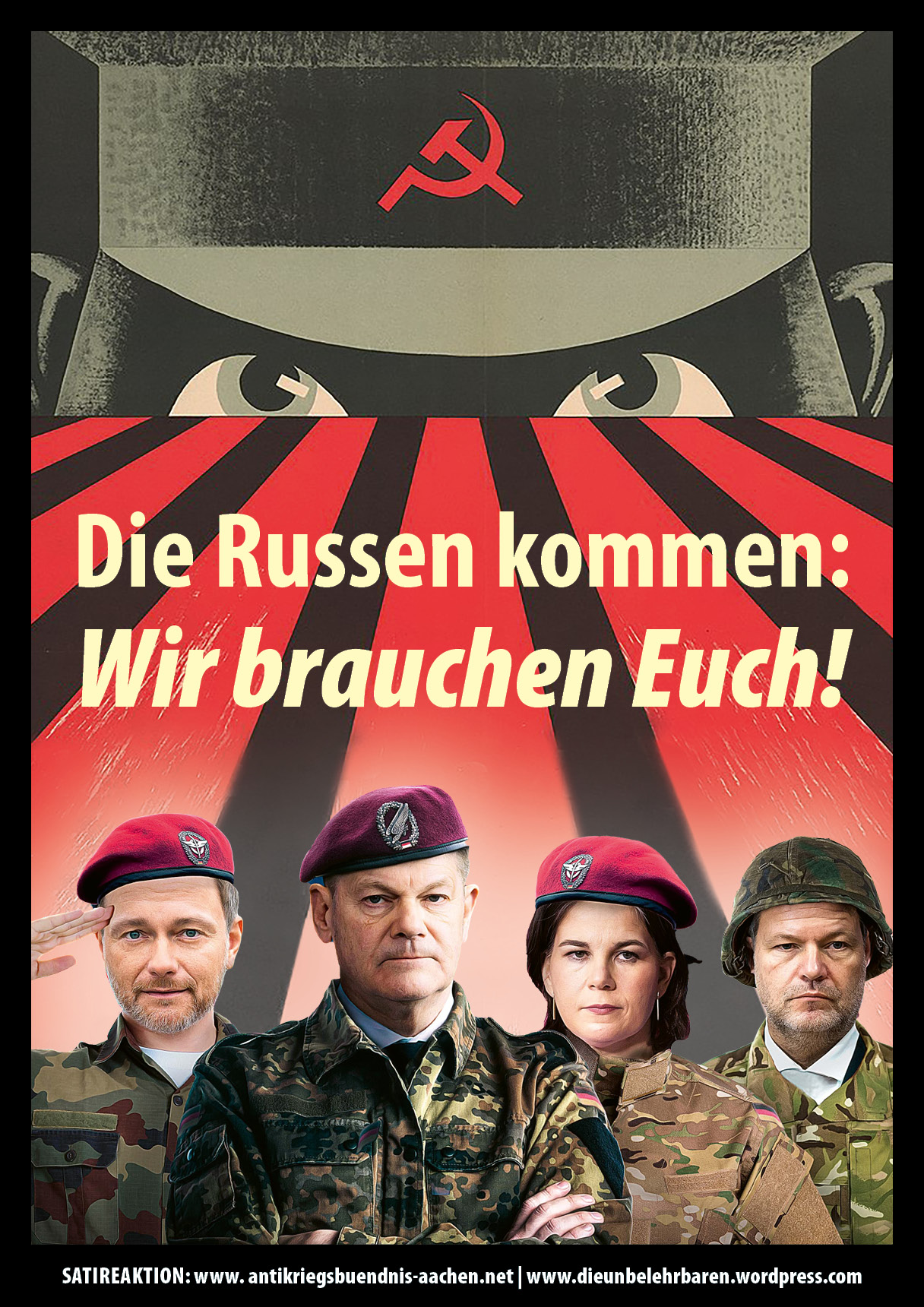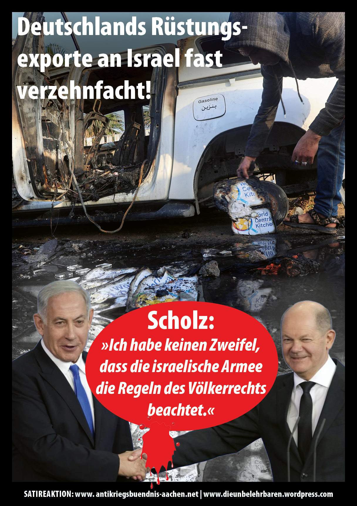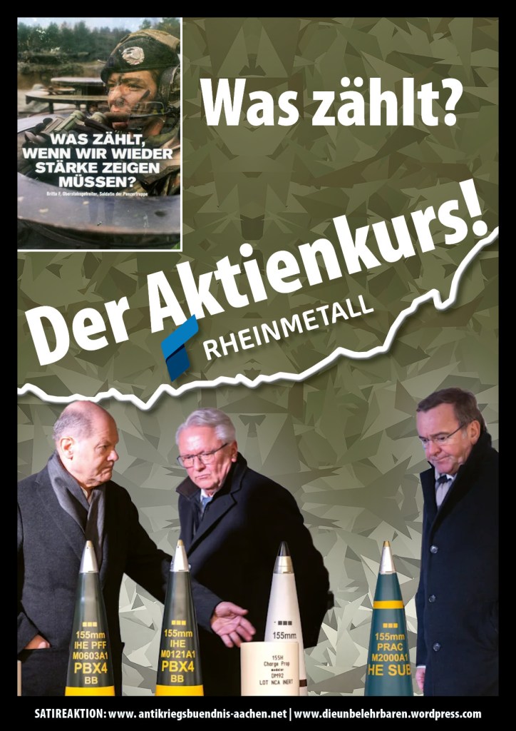 Die in Aachen versammelten Politiker:innen und Politikerdarsteller:innen nutzen das heutige Event, um eine weitere Eskalation im Krieg voranzubringen: es sollen erneut Panzer und andere Waffen im Wert von 2,7 Mrd € von Deutschland an die Ukraine geliefert werden, was in zynischer Weise als Gastgeschenk tituliert wird.