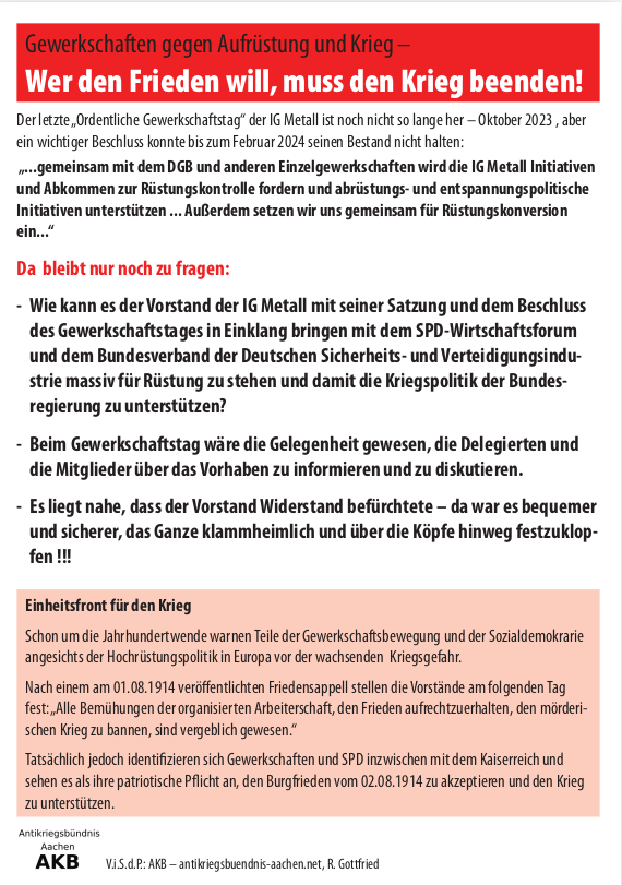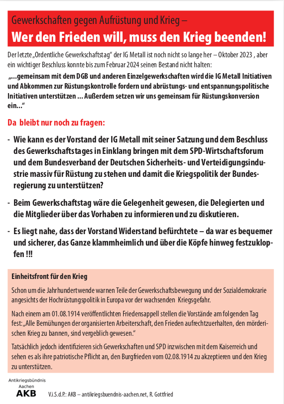 Gemeinsam mit dem SPD-Wirtschaftsforum und dem „Bundesverband der deutschen Sicherheits- und Verteidigungsindustrie“ hat sich der IG Metall-Vorstand der Hochrüstungspolitik der Ampel-Regierung angeschlossen. Hier die Stellungnahme des Antikriegsbündnisses Aachen: