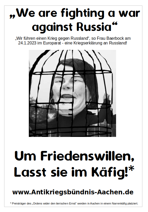 Am Samstag den 4.2.23 erhält Baerbock den Narrenpreis. Proteste gegen ihre kriegs-eskalierende Ukraine-Politik finden ebenfalls am Samstag in Aachen statt: